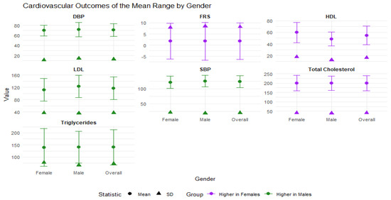 Figure 1 visualizes the CVD risk factors, which include FRS, blood pressure indices, and lipid profiles. Out of the seven cardiovascular-related variables analyzed, four were lower in females and three were lower in males. The females had lower mean values for DBP, SBP, LDL cholesterol, and triglycerides. These indicators suggest that, on average, females may have a more favorable cardiovascular profile in terms of blood pressure and harmful lipid fractions. Conversely, males exhibited lower values for the FRS, HDL cholesterol, and total cholesterol. While a lower FRS suggests a better overall risk profile for males, their lower HDL (“good” cholesterol) may offset some of this benefit.