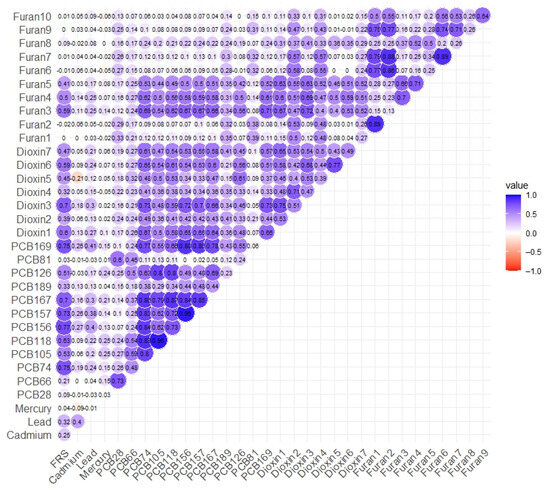Spearman’s correlation between pairs of metals, PCBs, dioxins, and furans on FRS.