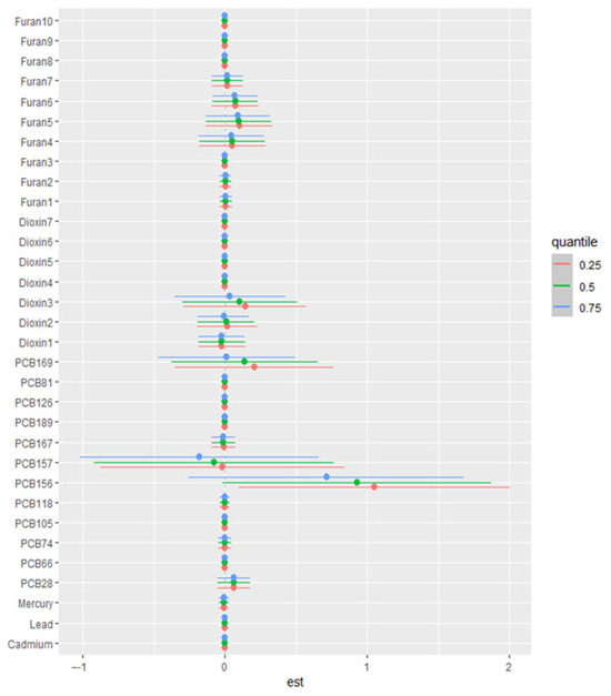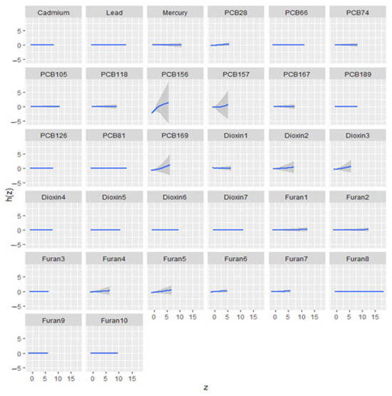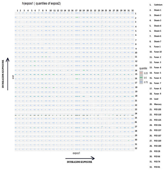 We constructed a univariate exposure–response function to determine how a single variable (exposure) affects each outcome (response) while keeping all other variables constant. Next, we determined the overall effect of all exposures on the health outcome at different increasing quantiles from 25% to 75%. We moved on to construct the single-exposure effects at 95% credible intervals to identify the change in response that is associated with the change in single exposure from its 25th to 75th quantile while all other exposures are fixed at a specific quantile (25th, 50th, or 75th). Then, we determined the single-variable interaction of each metal, PCBs, dioxins, and furans, comparing the effect of each exposure when all other exposures are fixed.