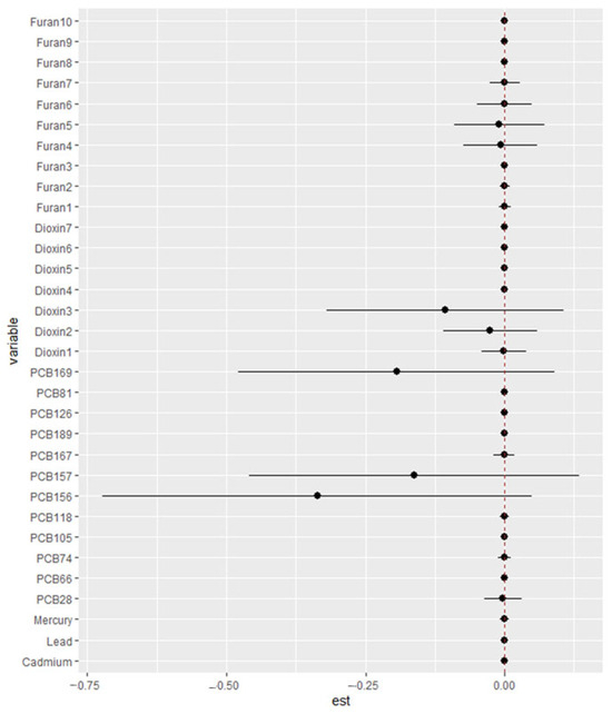 A similar grouping approach was applied for visualization in Supplementary Figure S1, with a total of 32 exposure variables analyzed and grouped accordingly. The first group includes 20 exposure variables in which females demonstrated lower mean concentrations than males. For metals and PCBs, the variables included cadmium, lead, PCB156, PCB157, PCB189, PCB81, and PCB169. Among dioxins, 1,2,3,7,8-Pentachlorodibenzo-p-dioxin (PeCDD), 1,2,3,4,7,8-Hexachlorodibenzo-p-dioxin (HxCDD), and 1,2,3,6,7,8-Hexachlorodibenzo-p-dioxin (HxCDD) showed lower levels in females. All 10 furans were predominantly lower in females, while mercury, PCB28, PCB66, PCB74, PCB105, PCB118, PCB167, PCB126, 1,2,3,7,8,9-Hexachlorodibenzo-p-dioxin (HxCDD), 1,2,3,4,6,7,8-Heptachlorodibenzo-p-dioxin (HpCDD), 1,2,3,4,6,7,8,9-Octachlorodibenzo-p-dioxin (OcDD), and 2,3,7,8-Tetrachlorodibenzo-p-dioxin (TcDD) were lower in males. This indicates that while females generally had lower exposures for most of these toxicants, there are notable exceptions where males exhibited a lower toxic burden.