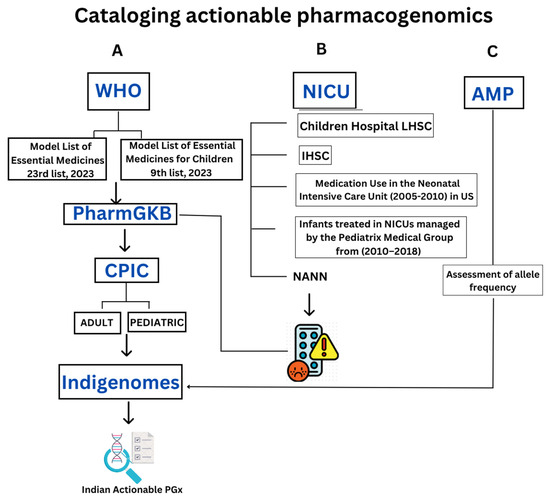 Previous studies have highlighted the importance of incorporating pharmacogenomic data into treatment protocols, with examples of genetic polymorphisms significantly affecting drug metabolism and efficacy [10,11,12,13]. There is literature on how pharmacogenomics can be incorporated into hospital records as either reactive or preemptive testing [15], on a population scale [16], and bydisease–drug specific guidelines [10] in different parts of the globe. However, the lack of comprehensive datasets tailored to Indian patients hinders the full integration of PGx into Indian clinical practice. This study seeks to address that gap by cataloging pharmacogenomic variants from key sources, including essential drugs listed by the World Heath Organization (WHO), drugs critical for neonatal care in the neonatal intensive care unit (NICU), and the minimum set of alleles recommended by the Association of Molecular Pathology (AMP).