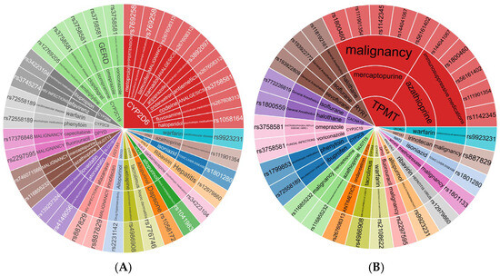 (A) Drugs with CPIC Level 1 and 2 evidence for adults with associated genes and medical conditions. (B): Drugs with CPIC Level 1 and 2 evidence for children with associated genes and medical conditions. The interactive HTML files are in Supplementary Graphs S1 and S2.
