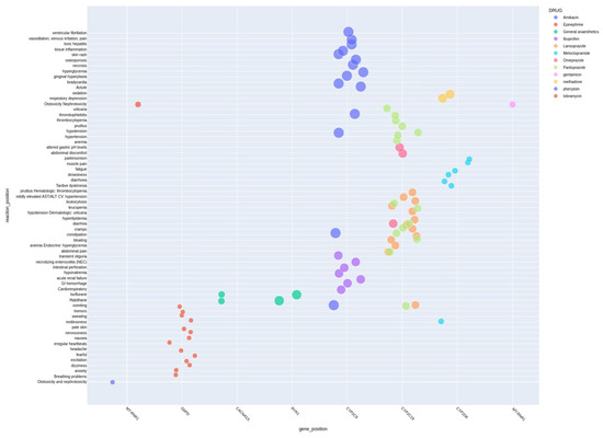 Bubble plot of adverse drug effects of Level 1 and Level 2 NICU drugs along with the genes associated with them.