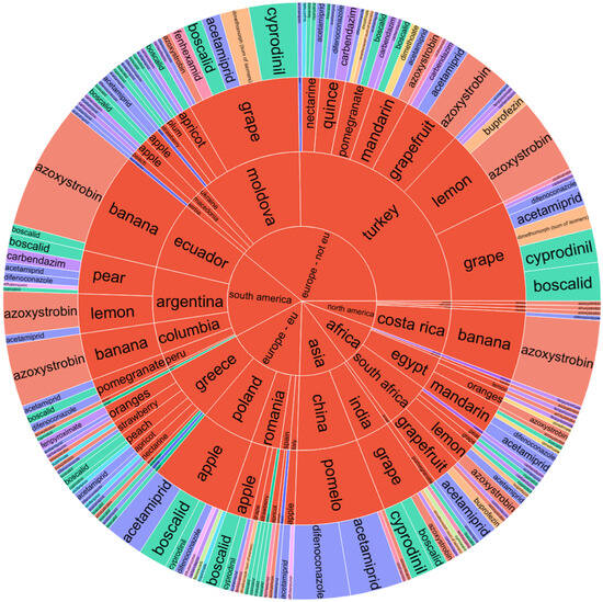 Sunburst chart for pesticide contamination of fruits depending on the continent and country of origin, product name, and pesticide type.