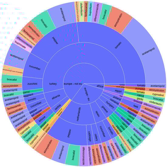 Sunburst chart for pesticide contamination of vegetables depending on the continent and country of origin, product name, and pesticide type.