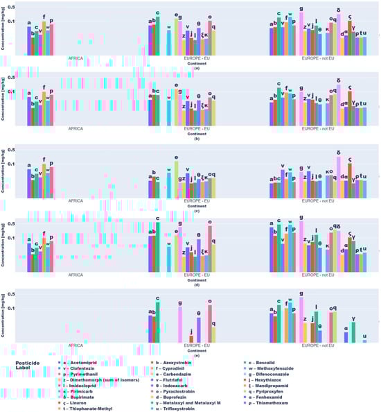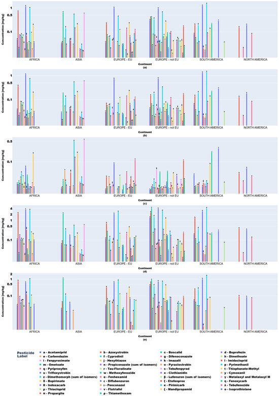 Regionally, azoxystrobin, imazalil, and pyrimethanil dominated African fruits while Asian samples showed boscalid, imazalil, and thiacloprid. In Europe (EU/non-EU) and South America, imazalil and pyrimethanil were prevalent. Imazalil residues in citrus fruits (e.g., grapefruits: 0.058–3.855 mg kg−1; lemons: 0.062–3.451 mg kg−1) exceeded EFSA MRLs [12] for bananas (0.01 mg kg−1) and approached limits for grapefruits (4 mg kg−1).