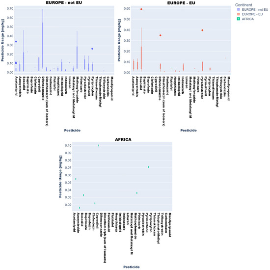 A comparative analysis of the sunburst plot for vegetables (Figure 2) reveals a persistent presence of these pesticide residues across the various studied vegetable types, sourced from both EU countries and Asia. For vegetables, the pesticide type showed a near-significant effect (p = 0.061), suggesting some variability in residue levels depending on the pesticide used, while no statistical significance was observed for continent or the interaction term (p = 0.911 and 0.712, respectively). Therefore, although descriptive analysis pointed toward regional residue trends (e.g., tomatoes from Turkey with difenoconazole and acetamiprid), these did not translate into statistically significant differences.