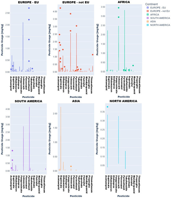 It was observed that all p-values were higher than 0.05, indicating that no statistically significant differences were detected for the examined factors. However, the use of ANOVA in this context remained fully justified. The analysis of variance was performed to assess whether the continent of origin, pesticide type, or their interaction had had a statistically significant effect on the pesticide residue levels observed in fruits and vegetables. Although no significant effects were found, this outcome was meaningful in itself and provides valuable insight: it suggests a lack of systematic variation in pesticide residues by continent or compound within the studied samples. It must be re-iterated that all 620 samples were collected from Romanian supermarkets, where sourcing is driven by centralized procurement contracts and commercial supply chains. These systems prioritize consistency and may therefore homogenize pesticide residue levels across different countries and continents. Moreover, the dataset reflected seasonal product availability, meaning that certain produce types had been imported from limited geographic sources, reducing within-group variability and statistical power. Some pesticide–continent combinations contained only a few samples, limiting the ability of the ANOVA model to detect subtle differences. Despite the lack of statistical significance, the application of ANOVA remains valid for hypothesis testing and methodological transparency. It demonstrates that, under current market requirements, residue levels in supermarket products were relatively uniform, with little variation attributed to the assessed categorical variables.