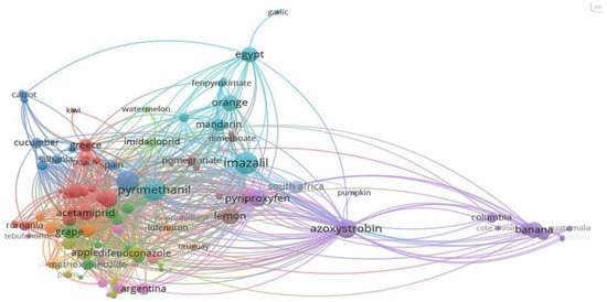 Clusters 4–6 demonstrated regional specialization: difenoconazole in Eastern European apples/plums (Cluster 4), tropical fungicides (azoxystrobin) and insect growth regulators (pyriproxyfen) in banana exports (Cluster 5), and post-harvest fungicides (imazalil, pyrimethanil) in Egyptian citrus (Cluster 6). Clusters 7–12 reflected targeted applications: dimethomorph in Indian/Ukrainian vegetables (Cluster 7), insecticides (buprofezin, dimethoate) in Israeli/Peruvian citrus (Cluster 8), and neonicotinoids (clothianidin, imidacloprid) in Chinese pomelo and Brazilian watermelon (Clusters 10–11). Key distinctions included fungicide dominance in temperate crops (e.g., Clusters 1, 4, 9) versus insecticide reliance in tropical/horticultural systems (e.g., Clusters 5, 8). Export-driven patterns (Turkey’s vegetables, Moldova’s apples) underscored trade’s role in residue profiles. Cluster 12 weakly linked South Africa to pumpkin trade, lacking strong pesticide ties.