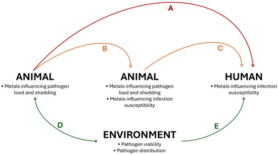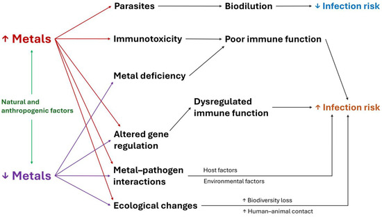 Metals may also influence the likelihood of spillover events involving parasites. In fish, greater metal availability may be associated with greater parasitemia, as discussed previously in the Section “Impacts on fish”. In red foxes, metal levels affect host interactions with Echinococcus multilocularis, the parasite responsible for alveolar echinococcosis, a zoonotic disease [50]. This suggests that variations in host metal levels could influence fox–parasite dynamics, potentially affecting the risk of zoonotic transmission of both known and emerging diseases to humans.
