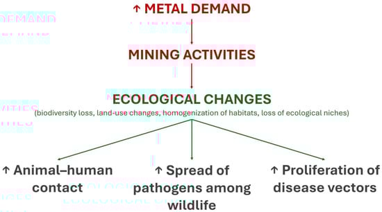 The ecological effects of metals on infectious diseases may be indirect and must also be highlighted (Figure 2). Mining activities driven by the growing demand for metals by human societies cause ecological changes that favor the spread of pathogens. For example, deforestation in the Amazon due to mining and other anthropogenic activities promotes the loss of biodiversity, which is associated with the greater spread of pathogens among wild species [81]. Mining activities in highly biodiverse ecosystems such as the Amazon forest also increase human contact with wild animals and disease vectors (e.g., mosquitoes), which facilitates the exchange of pathogens between humans and animals, favoring both zoonoses and anthropozoonoses [82,83]. In summary, metals are at the center of direct and indirect ecological relationships that, together with their physiological and immunological effects, affect the risk of infectious diseases in different ways.