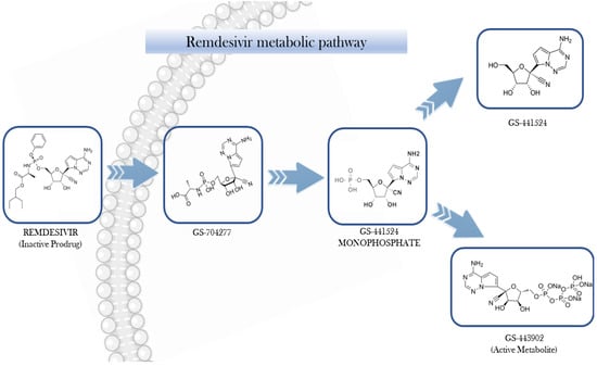 After intravenous administration, RDV undergoes intracellular conversion into its active form, the nucleoside triphosphate analogue GS-441524-TP (also known as GS-443902). Meanwhile, its nucleoside form, GS-441524, produced through dephosphorylation, can be detected in the plasma (Figure 1) [11].