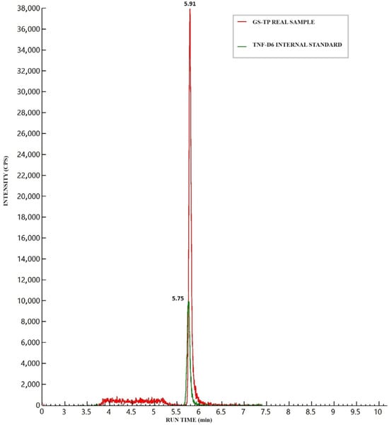 The observed LOD was 0.104 ng/sample, while the LLOQ was at least equivalent to that of the lowest calibrator standard (STD1) (0.313 ng/sample), in accordance with FDA guidelines. Chromatograms for a blank (analyte-free) sample and LLOQ are presented in Figure S1. The LLOQ accuracy and precision, as assessed in quality control samples, were 96% and 95% respectively.