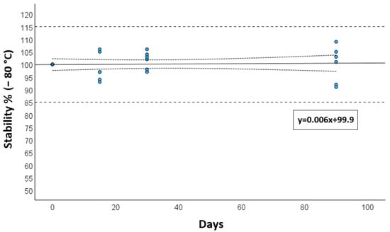 Long-term storage stability, assessed at −80 °C, showed a deviation of less than 15% after 3 months, as presented in Figure 3.