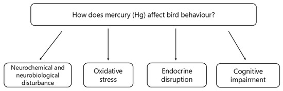This review aims to provide a comprehensive synthesis of existing knowledge on the behavioural ecotoxicology of Hg in birds, using Tinbergen’s four questions, causation (mechanism), ontogeny (development), function (adaptive value), and evolution (phylogeny), as a conceptual framework [55]. This approach enables systematic organisation and interpretation of the diverse effects of Hg exposure on bird behaviour, linking proximate mechanisms to ultimate evolutionary consequences and thereby reducing interpretive bias.