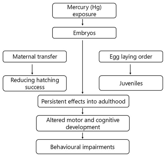 Bird developmental stages represent periods of heightened sensitivity to environmental stressors, during which Hg exposure can lead to behavioural impairments later in life [28,153] and references therein. Mercury exposure at critical developmental stages significantly shapes avian behavioural outcomes, with both embryonic and juvenile exposure routes playing critical roles (Figure 2).