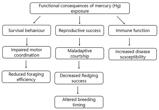 The functional component of Tinbergen’s four questions examines the adaptive significance of specific behaviours in relation to an animal’s reproductive success and survival [170]. In the context of Hg pollution, the functional consequences of Hg-induced behavioural alterations are evaluated by determining the extent to which sublethal Hg exposure affects the fitness and population stability of birds [28,153]. Although the behavioural shifts that result from Hg exposure may appear to be subtle, experimental studies have shown that these changes have significant implications for survival and reproductive success, thereby influencing the overall population dynamics (Figure 3) [36,120].