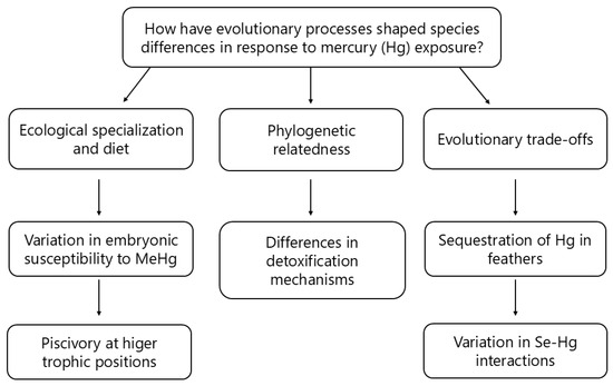 To comprehend the evolutionary (phylogenetic) aspect of how bird species handle Hg exposure, it is necessary to investigate the selective pressures that have influenced the physiological and behavioural adaptations in avian lineages. Tinbergen’s fourth question underlines the adaptive significance and evolutionary history of physiological and behavioural attributes [170]. This perspective encourages the investigation of whether specific bird species inherently possess characteristics influenced by their evolutionary history that affect their sensitivity and behavioural responses to Hg exposure. Pronounced variations in embryonic susceptibility to MeHg across species suggest evolutionary divergences driven by ecological specialization and diet [178,184]. Piscivorous species, occupying higher trophic positions, typically accumulate higher MeHg concentrations compared to insectivorous or granivorous species, resulting in differing selective pressures for detoxification or behavioural adaptations [2,29,153]. To strengthen the direct link to phylogeny, it is essential to emphasise how shared evolutionary histories between closely related species can influence their ability to detoxify Hg. Species within the same family or genus, such as the aforementioned zebra finch and house finch (Haemorhous mexicanus), may exhibit differences in their detoxification mechanisms, possibly due to evolutionary divergence shaped by distinct ecological pressures. However, it is important to clarify that the differences in detoxification abilities would likely be more strongly influenced by ecological factors (e.g., diet and habitat) and evolutionary trade-offs (e.g., specialisation vs. generalisation) than by their phylogenetic relatedness alone (Figure 4).