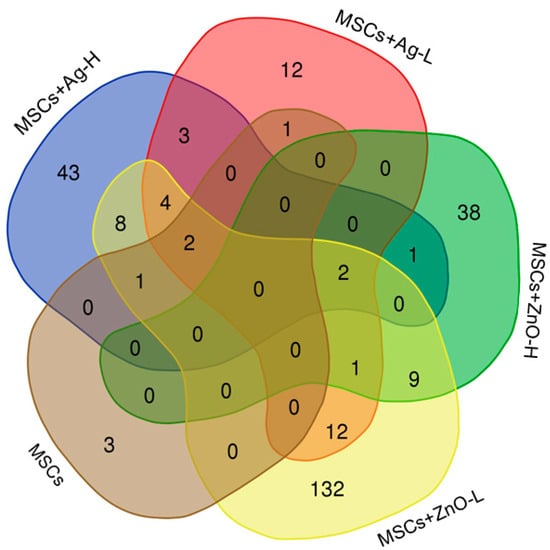 The pathway analysis identified several common deregulated pathways: for MSCs+Ag-H and MSCs+ZnO-H, the “neutrophil degranulation” and “innate immune system” pathways were detected, while for MSCs+Ag-L and MSCs+ZnO-L, pathways involved in “formation of the cornified envelope” and “keratinization” were found (Table 5). In addition, for MSCs+ZnO-L, “fatty acid biosynthesis” and “fatty acid metabolism” pathways were affected. The treatment with Ag-L alone affected pathways involved in “neutrophil degranulation”, the “innate immune system”, and the “immune system”.