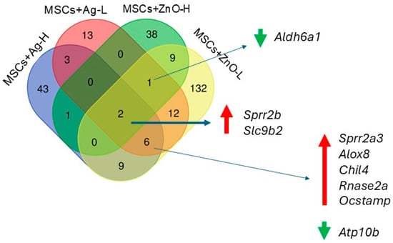 A Venn diagram of the number of unique and common deregulated mRNAs resulting from skin injury treatment with combinations of MSCs+Ag/ZnO NPs at various doses of NPs (using the wounded but untreated skin group as the reference). Green arrows denote downregulation while red arrows indicate upregulation of mRNA expression.