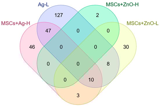 Skin injury was the most significant factor affecting the whole-genome mRNA expression profiles: a total of 2006 mRNAs were downregulated and 2216 were upregulated as a result of wound infliction. Further changes in mRNA numbers resulting from the individual treatment scenarios were rather modest (Table 4; for a complete list of deregulated mRNAs, see Supplementary Table S1; FASTQ files are stored in the public repository at: Skin Wound Healing_mRNA expression), resulting in a maximum of 216 deregulated mRNAs (from the application of Ag-L alone). Interestingly, treatment with ZnO alone (regardless of the dose) had no impact on the number of deregulated mRNAs. The combined MSCs+ZnO treatment affected about twice as many mRNAs than the combined MSCs+Ag treatment. The application of MSCs alone affected the expression of seven mRNAs, of which three were unique to this type of treatment (Acot11, Lair1, Pyhin1) (Figure 1). It should be further noted that despite the differences in the number of deregulated genes between samples treated with Ag and ZnO NP, there were common genes affected by both types of NPs (Figure 2). The genes common to at least three treatment conditions include Aldh6A1 (MSCs+Ag-L, MSCs+ZnO-L, and MSCs+ZnO-H) and Sprr2b and Slc9b2 (MSCs+Ag-L, MSCs+Ag-H, MSCs+ZnO-L, and MSCs+ZnO-H). The expression of Sprr2a3, Alox8, Chil4, Rnase2a, Ocstamp, and Atp10b was commonly affected by the MSCs+Ag-H, MSCs+Ag-L, and MSCs+ZnO-L treatments.
