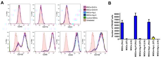 (A) Flow cytometry analysis of MSC surface markers in samples treated with selected concentrations of Ag and ZnO NPs. MSCs were cultured for seven days with NPs and then analyzed by flow cytometry. Representative histograms from 3 independent measurements are shown. The pink-tinted histogram represents the control unlabeled MSCs. (B) The persistence of MSCs at the injury site, in the surrounding tissue, and in the draining lymph nodes. Fluorescently labeled MSCs were detected by flow cytometry analysis as the number of CD45−PKH26+ cells in a single-cell suspension prepared from the injury site (INJ), surrounding tissue (ST), or axillary lymph nodes (LN). Each bar represents the mean+SEM from 4 independent experiments.