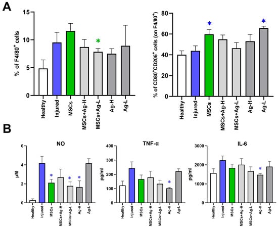 (A) The percentage of macrophages (F4/80+ cells) and activated regulatory macrophages (expressed as the percentage of CD80+CD206+ cells among the F4/80+ population) at the injury site was assessed by flow cytometry. Each bar represents the mean+SEM from 3 independent experiments. Values with an asterisk are significantly different (* p < 0.05) from the control value (green asterisk: the group treated with MSCs alone was used as a reference; blue asterisk: the injured group was used as a reference). (B) Analysis of the production of selected inflammatory molecules secreted by activated macrophages. The production of NO, TNF-α, and IL-6 in skin wound samples stimulated with IFN-γ and LPS was assessed by the Griess reaction and ELISA. Each bar represents the mean+SEM from 3 independent experiments. Values with an asterisk are significantly different (* p < 0.05) from the control value (green asterisk: the group treated with MSCs alone was used as a reference; blue asterisk: the injured group was used as a reference).