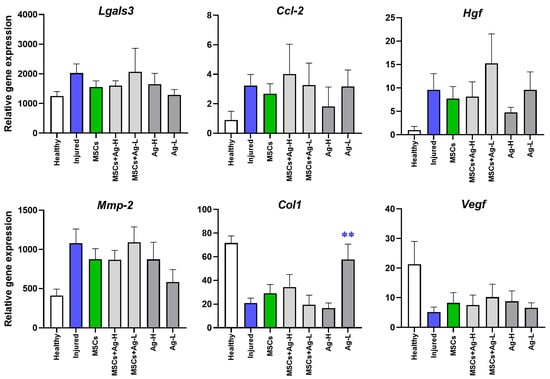 The expression of selected immunomodulatory and regenerative molecules as assessed by RT-PCR in samples collected from the sites of injury. Changes in the expression of galectin-3 (Lgals3), chemokine CCL-2 (Ccl-2), hepatocyte growth factor (Hgf), matrix metalloproteinase-2 (Mmp-2), collagen1 (Col1), and vascular endothelial growth factor (Vegf) were analyzed in skin wounds 7 days after the application of different types of treatment by RT-PCR. Each bar represents the mean+SEM from 4 independent experiments. A significant difference (** p < 0.01) when compared with the control value (injured group) was observed for Col1 expression only; all other gene expression changes were not statistically significant.