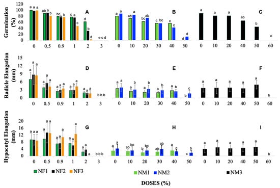 Dose–response patterns of key physiological parameters in Lactuca sativa (lettuce) seeds exposed to nanofertilizers (NFs) and nanomaterials (NMs): (A–C) Germination rates (%) for NFs, NM1, NM2, and NM3, respectively. (D–F) Radicle elongation (mm) for NFs, NM1, NM2, and NM3, respectively. (G–I) Hypocotyl elongation (mm) for NFs, NM1, NM2, and NM3, respectively. Different lowercase letters on the bars indicate statistically significant differences between doses (ANOVA, Tukey’s HSD, p < 0.05); full statistical results are available in the Supplementary Material (Supplementary Tables S6–S11).