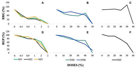 For Figure 2D,E, corresponding to nanomaterials NM1 and NM2, the applied doses range from 0 to 50%, following a similar declining trend. RRG and RGP remain above 80% at lower concentrations (0–10%), but from the 30% dose onwards, a significant reduction is observed. At 40% dose, RRG falls to approximately 30–50%, and at 50%, it drops close to 0%, indicating substantial toxicity. NM2 exhibits slightly higher RRG values at intermediate doses compared with NM1, but both materials show similar inhibition patterns.