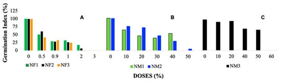 Figure 1B,C shows the effect of NM1 (zinc oxide), NM2 (titanium dioxide), and NM3 (clinoptilolite) nanomaterial concentrations on Lactuca sativa germination (Supplementary Tables S2–S5). In contrast to the nanofertilizers, in which the lethal doses for germination were found to be in the range of 0 to 3%, the nanomaterials in this evaluation were applied at higher doses, reaching up to 60%. This is due to the fact that the nanomaterials, in this case, are not mixed directly with complete fertilizer, but are evaluated at higher concentrations to study their isolated effects.