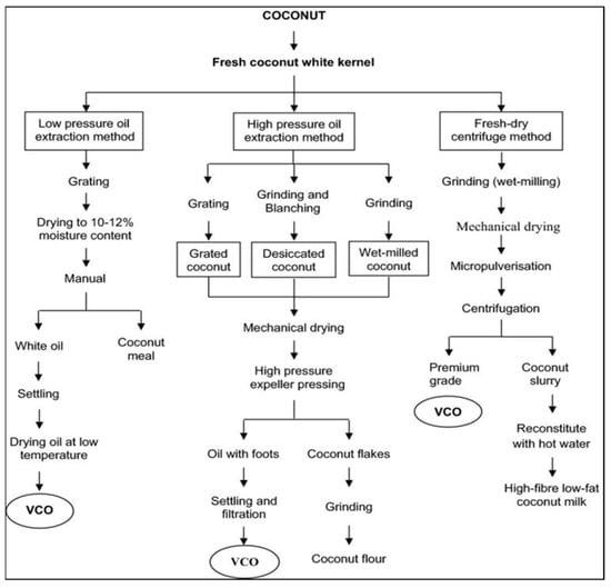 Traditionally, coconut oil is extracted by pressing copra (dry process) that has been exposed to a very high temperature and/or sunlight to remove moisture [41]. The coconut oil is produced by crushing copra, which contains about 60–65% of the oil [12]. Copra is the dried kernel obtained by smoke-drying, sun-drying, or a combination of both. Then, the clean, ground, and steamed copra is pressed with a screw press expeller or hydraulic press to obtain the copra coconut oil. However, the drying/copra method is traditionally unhygienic; in fact, the handling makes the extracted oil unsafe for human consumption. Therefore, the coconut oil undergoes a refining, bleaching, and deodorizing process. This process requires heating the oil at high temperatures, between 204 °C and 245 °C, which destroys the essential amino acids, tocopherols (e.g., vitamin E), and other valuable phytocompounds present in the coconut oil [10]. Hence, VCO is a healthier oil than commercial copra oil due to its medium-chain saturated fatty acid content and higher amounts of polyphenols [11,42].