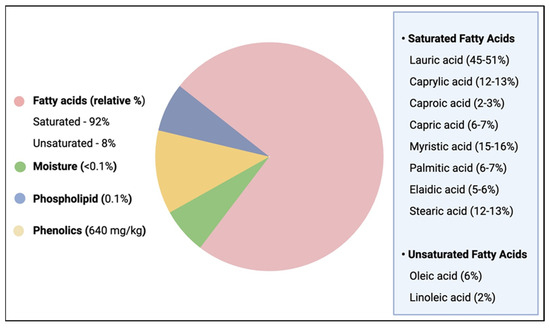 VCO is the pure and healthy form of coconut oil with a coconut aroma and a clear water appearance in contrast to copra coconut oil with a yellow color, which is sometimes due to microbial contaminants or high-temperature processing [10,43]. VCO is rich in natural bioactive compounds including saturated fatty acids (SFAs) (mainly medium-chain FAs), and phospholipids (e.g., tocopherols and sterols), as well as phenolic acids and polyphenols, in addition to minor components like flavonoids [40] (Figure 3).