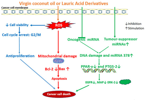 Molecular mechanisms associated with anticancer effects of VCO or LA and their derivatives. VCO, LA, and their derivatives, upon entering the cell, interact directly with molecules and organelles to generate ROS and/or oxidative stress, which leads to depressed cancer cell viability, anti-proliferation, mitochondrial damage, and modulation of cancer-cell-death-related miRNAs. These alterations cause apoptotic cascades via cell cycle arrest, depressed expression of proteins, and genes that provoke cancer cell death.