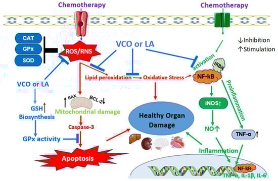 VCO or LA protective mechanisms against chemotherapy-induced organ toxicity. Chemotherapeutic drugs centrally induce ROS generation and oxidation stress for promotion of apoptosis and inflammatory mechanisms in healthy organs. VCO or LA inhibits these mechanisms at various key mechanistic points, leading to elevation of antioxidant mechanism and dampening or blockage of apoptosis and inflammatory process.