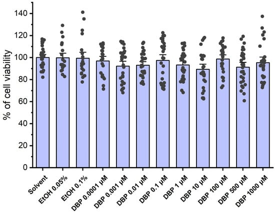Percentage (%) of cell viability of HUASMCs after exposure to DBP. The bars represent the mean values, the vertical lines the SEM, and the individual dots the replicates of 9 independent experiments with different HUCs.