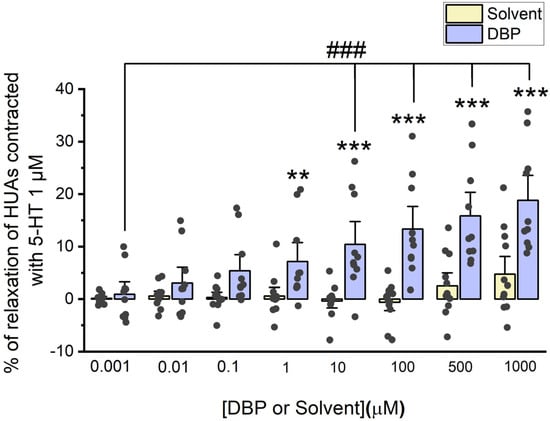Evaluation of DBP effect on HUA contractions. The results are expressed as the percentage (%) of relaxation after contraction with 5-HT (1 μM), using 7 different HUCs for both the solvent- and DBP-treated groups. The bars represent the mean values, the vertical lines the SEM, the individual dots the replicates of each experiment, the symbol * the significant differences between both groups, and the symbol # the significant differences among DBP concentrations.