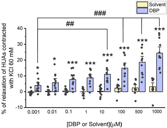 Evaluation of DBP effect on HUA contractions. The results were expressed as percentage (%) of relaxation after contraction with KCl (60 mM), using at least 6 different HUCs for both the solvent- and DBP-treated groups. The bars represent the mean values, the vertical lines the SEM, the individual dots the replicates of each experiment, the symbol * the significant differences between both groups, and the symbol # the significant differences among DBP concentrations.