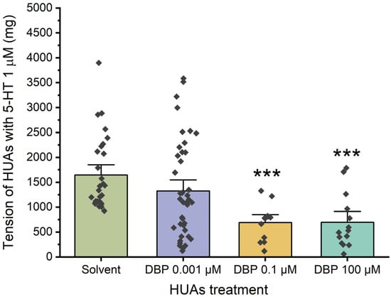 Regarding the genomic effects of DBP, the HUAs were incubated for 24 h with three different concentrations of the compound: 0.001 μM, 0.1 μM, and 100 μM. Additionally, a control group was treated with 0.01% ethanol, which corresponds to the maximum concentration used. Then, the arterial tension following contraction with 5-HT was analyzed, as illustrated in Figure 4. There is a significant decrease in the arteries incubated with DBP 0.1 μM (p < 0.001) and 100 μM (p < 0.001) compared to the solvent-treated arteries.