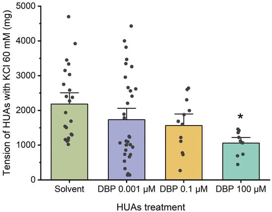 Tension (mg) upon KCl (60 mM) contraction of HUAs incubated with DBP (0.001, 0.1, 100 μM). At least 4 different HUCs were used for both solvent- and DBP-treated groups. The bars represent the mean values, the vertical lines the SEM, the individual dots the replicates of each experiment, and the symbol * the significant differences between both groups.