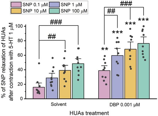 Percentage (%) of SNP relaxation of HUAs incubated with DBP (0.001 μM) after contraction with 5-HT (1 μM). At least 6 different HUCs were used for both solvent- and DBP-treated groups. The bars represent the mean values, the vertical lines the SEM, the individual dots the replicates of each experiment, the symbol * the significant differences between both groups, and the symbol # the significant differences among the SNP concentrations.
