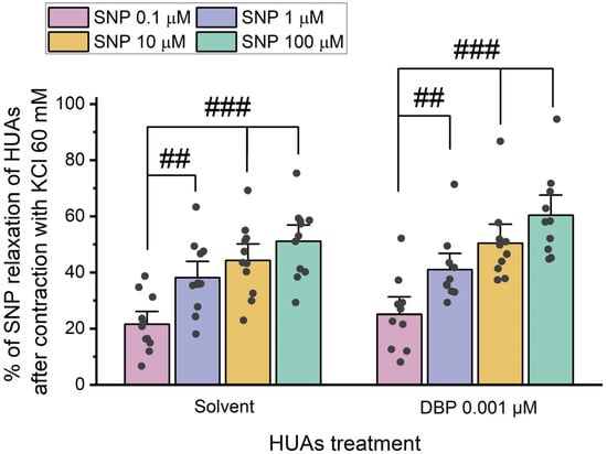 Percentage (%) of SNP relaxation of HUAs incubated with DBP (0.001 μM) after contraction with KCl (60 mM). At least 6 different HUCs were used for both solvent- and DBP-treated groups. The bars represent the mean values, the vertical lines the SEM, the individual dots the replicates of each experiment, and the symbol # the significant differences between the SNP concentrations.