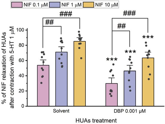 Percentage (%) of Nif relaxation of HUAs incubated with DBP (0.001 μM) after contraction with 5-HT (1 μM). At least 6 different HUCs were used for both solvent- and DBP-treated groups. The bars represent the mean values, the vertical lines the SEM, the individual dots the replicates of each experiment, the symbol * the significant differences between both groups, and the symbol # the significant differences among the Nif concentrations.