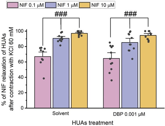 Percentage (%) of Nif relaxation of HUAs incubated with DBP (0.001 μM) after contraction with KCl (60 mM). At least 6 different HUCs were used for both solvent- and DBP-treated groups. The bars represent the mean values, the vertical lines the SEM, the individual dots the replicates of each experiment, and the symbol # the significant differences among the Nif concentrations.