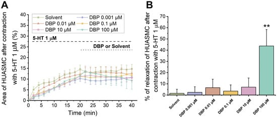 Figure 10 summarizes the direct effects of DBP (0.001 μM, 0.01 μM, 0.1 μM, 10 μM, and 100 μM) at the cellular level. In Figure 10A, a temporal profile of the effects of 5-HT (1 μM) followed by DBP is shown. Figure 10B represents the effects of DBP on HUASMC after contraction with serotonin, where a significant difference was found between the solvent- and DBP-treated groups at the highest concentration, 100 μM (p = 0.002), indicating that DBP induced relaxation of HUASMC.