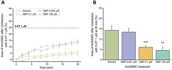 Effects of 24 h exposure to DBP (0.001, 0.1, or 100 μM) after HUASMCs 5-HT (1 μM) contraction. (A) Time profile of 5-HT-induced contraction in HUASMCs after incubation with DBP. The data are presented as a percentage (%) of the compensated area reduction, the symbols indicate the mean values, and the vertical lines the SEM. (B) Effects on the area of the HUASMCs after 5-HT contraction (20 min). The results are expressed as the percentage of the compensated area reduction. The bars represent the mean values, the vertical lines the SEM, and the symbol * significant differences between solvent- and DBP-treated groups.