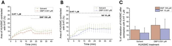 Effects of 24 h exposure to DBP (0.001 μM) on the HUASMCs. Time profile of HUASMCs contraction induced by 5-HT (1 μM) followed by relaxation induced by (A) SNP (100 μM) or (B) Nif (10 μM). The data are expressed as a percentage (%) of compensated area reduction, the symbols indicate the mean values, and the vertical lines the SEM. (C) Vasorelaxant effects of SNP and Nif in HUASMC contracted with 5-HT. The results are expressed as the percentage of relaxation. The bars represent the mean values, and the vertical lines the SEM. Data include at least 6 individual cells from 3 different HUCs.