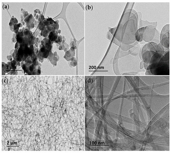 TEM was used to visualize the h-BN and BNNT and assess their shape and size. The hBN particles were found present in an aggregated state on the grids; however, individual hBN particles of flakes with round-shaped edges could be identified with 50% of the population with mean diameters of 100–400 nm (Figure 1a,b), consistent with the characterization of this material performed by other authors [8]. The BNNT puffball sample after dispersion in ethanol consisted of a tangled arrangement of long (>200 µm reported by manufacturer) flexible multi-walled BNNTs, among which there is also a small proportion of hBN empty-faceted onions (Figure 1c). Individual thin few-layered BNNTs with widths of 10–20 nm could be identified (Figure 1d).