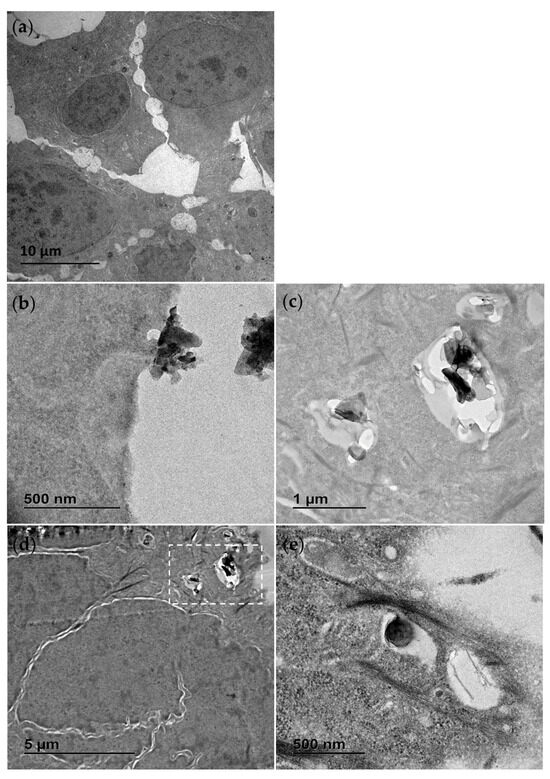 Transmission electron microscopy (TEM) images of RTgill-W1 cells untreated (a) and exposed for 24 h to 25 µg/mL h-BN showing close interaction with the plasma membrane (b) and uptake into the intracellular vesicles (c–e). (c) is the section of (d) marked with the white dotted line box.