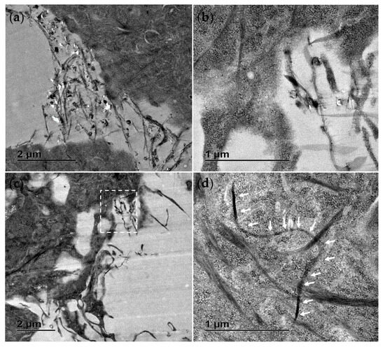 Transmission electron microscopy (TEM) images of RTgill-W1 cells exposed for 24 h to 25 µg/mL BNNT showing material direct entry across the plasma membrane (a) as well as widespread distribution free in the cytosol (b–d). (b) is the section of (c) marked with the white dotted line box. White arrows indicate the distinct flexible structure of the BNNT.